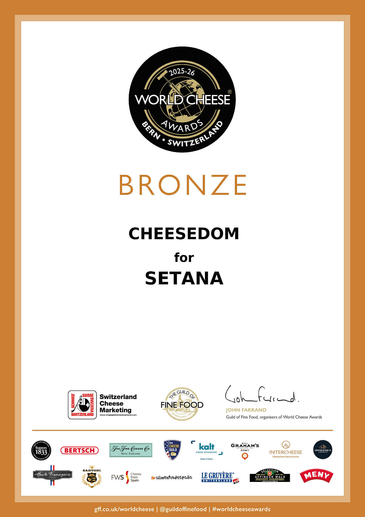 2025年11 月 13 日(木)から11 月 15 日(土)の期間、スイス・ベルンで開催された、世界で最も権威のあるコンテストの一つである「World Cheese Awards 2025」において昨年に続いて瀬棚を出品させていただき、結果としてはBronzeと昨年のSuper Goldに続く2年連続の受賞という身に余る評価をいただきました。